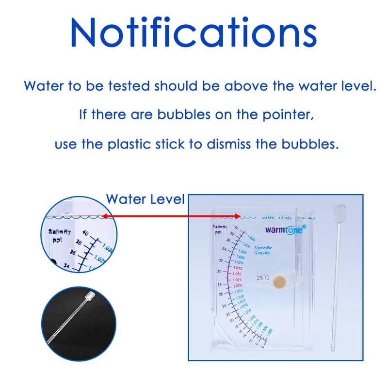 - 🐠 Quickly, easily, and accurately measurement: With this hydrometer saltwater aquarium test kit, you can test your marine aquarium's salt level and specific gravity, and It is optimum to be put into below 6" deep water to avoid the error caused by the oil film on the water.