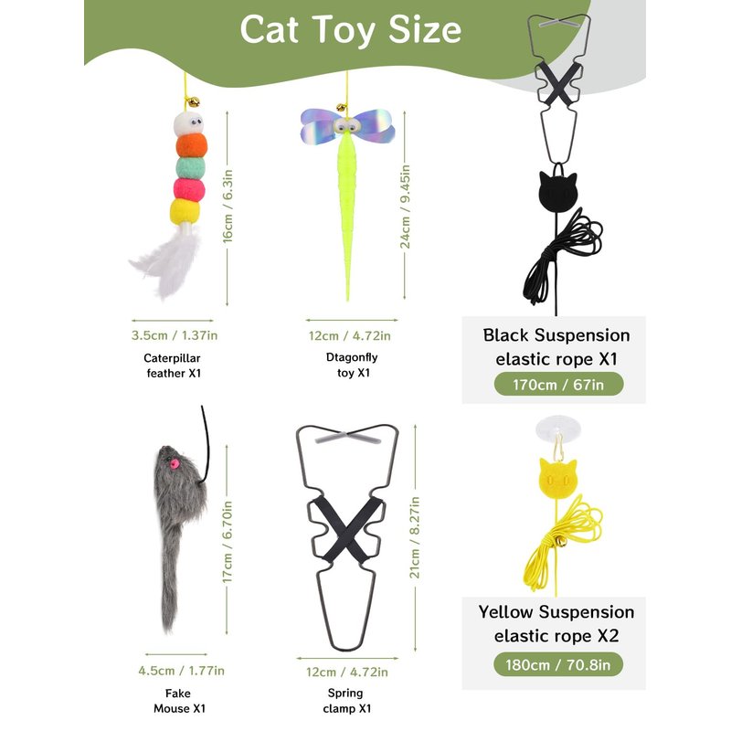 Products Included: 1* Upgraded tripod with spring, 1* Hanging mouse cat toy, 1*feather tail toys in the shape of caterpillars, 1*simulated dragonfly.