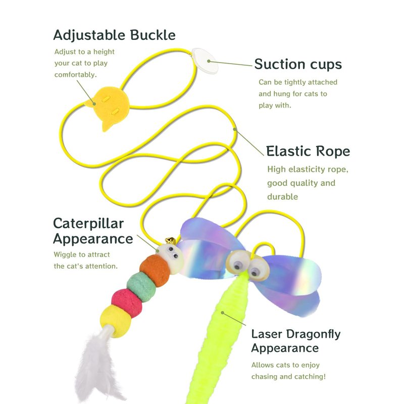 - Prevent damage to furniture: Interactive cat toy, feather tail toys in the shape of caterpillars, simulated dragonfly. they are all equipped with ropes, and you can hang them up. the sound of the bells can attract the cat's attention, allowing them to play and consume energy, preventing the cat from damaging furniture such as sofas