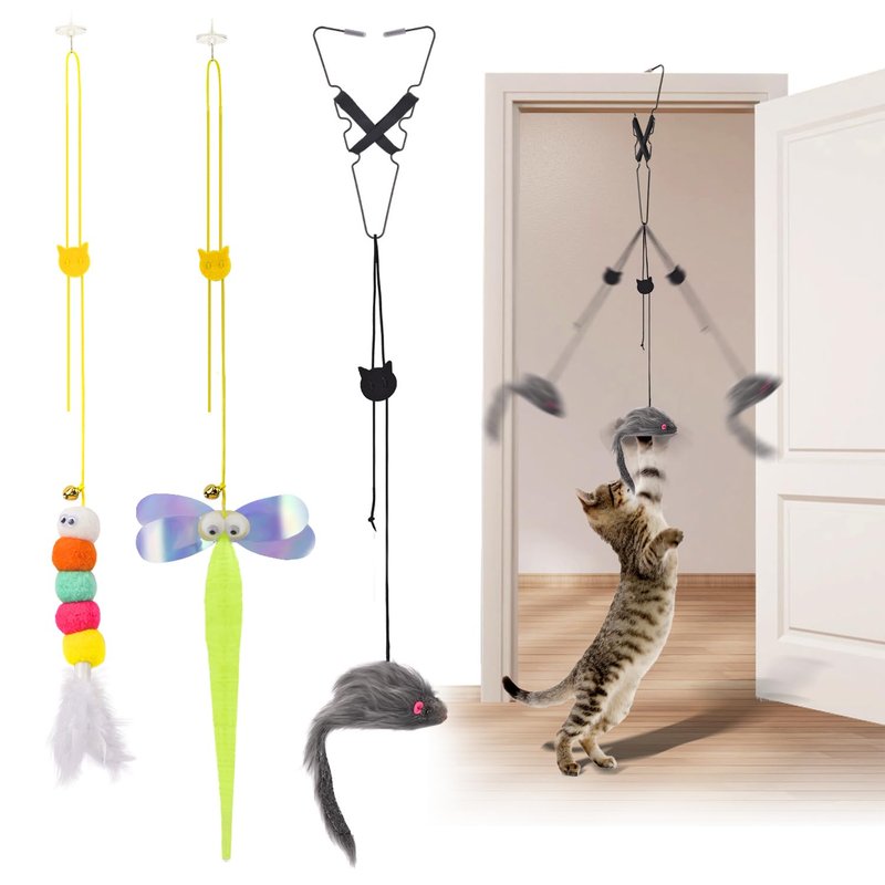 - Safe and Durable: Upgraded version of the three-legged hook with spring has more stability and safety, not easy to fall. The simulation toy model is safe and non-toxic, so that cats can bite and chew safely. Whether running or jumping, this door hanging cat toy can withstand the cat's play firmly