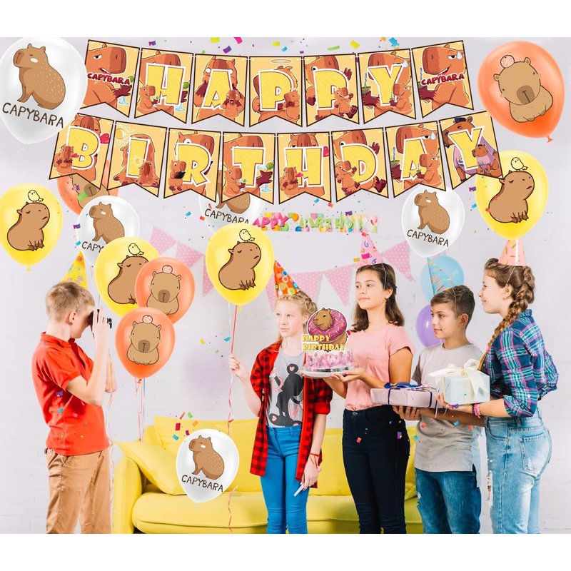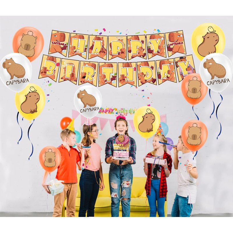 Specification: Theme: Capybara Material: Cardboard, latex Color:Yellow, Orange, White Package Includes: 1* Capybara HAPPY BIRTHDAY banner 1*Capybara HAPPY BIRTHDAY cake topper 12* Capybara cupcake toppers 18* Capybara balloons Perfect for capybara birthday party decoration, capybara theme party decoration, birthday party decoration, capybara party supplies, room decoration, home decorations, party decoration and more.