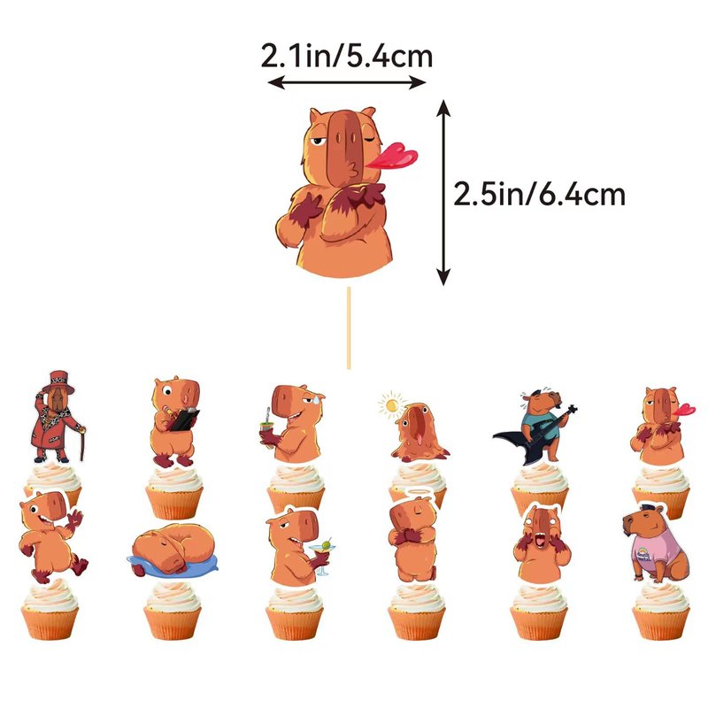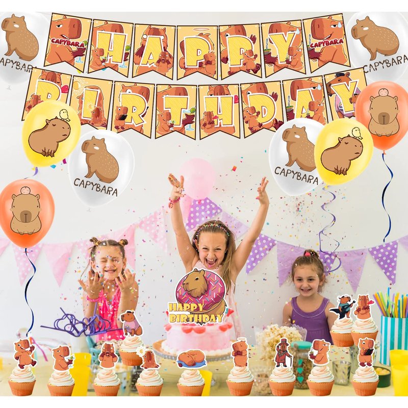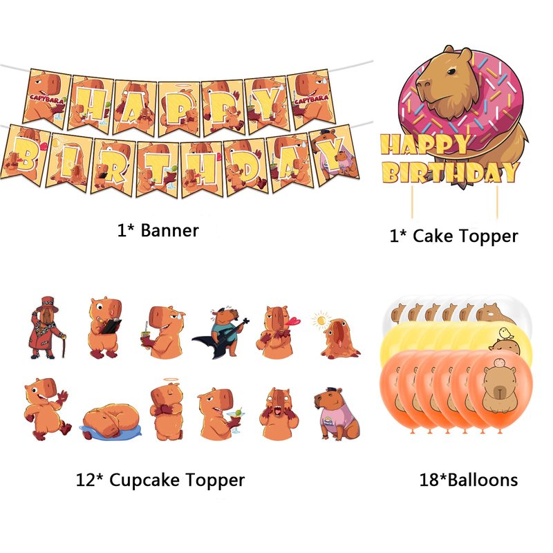 - Capybara Party Decorations: Package includes 1* capybara HAPPY BIRTHDAY banner, 1*capybara HAPPY BIRTHDAY cake topper, 12* capybara cupcake toppers, 18* capybara balloons
