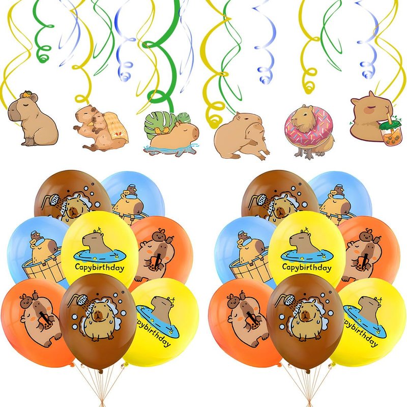 - 1. Capybara Party Decorations: Package includes 1* capybara birthday banner, 1*capybara Birthday cake topper, 12* capybara cupcake toppers, 16* capybara balloons,12*spiral