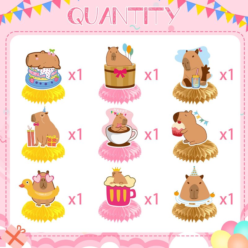 - Our cute capybara birthday party decorations set include 9PCS different patterns capybara table honeycomb centerpieces while the size of each honeycomb centerpieces is about 6.5 inches.