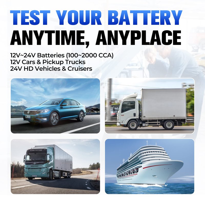 TOPDON BT200 car battery diagnostic tester can work on all 12V and 24V 100-2000 CCA batteries including regular flooded, AGM flat plate, AGM spiral, as well as GEL batteries, with multiple applications for a broad array of vehicles, Such as a car, truck, marine, boat, motorcycle and more.