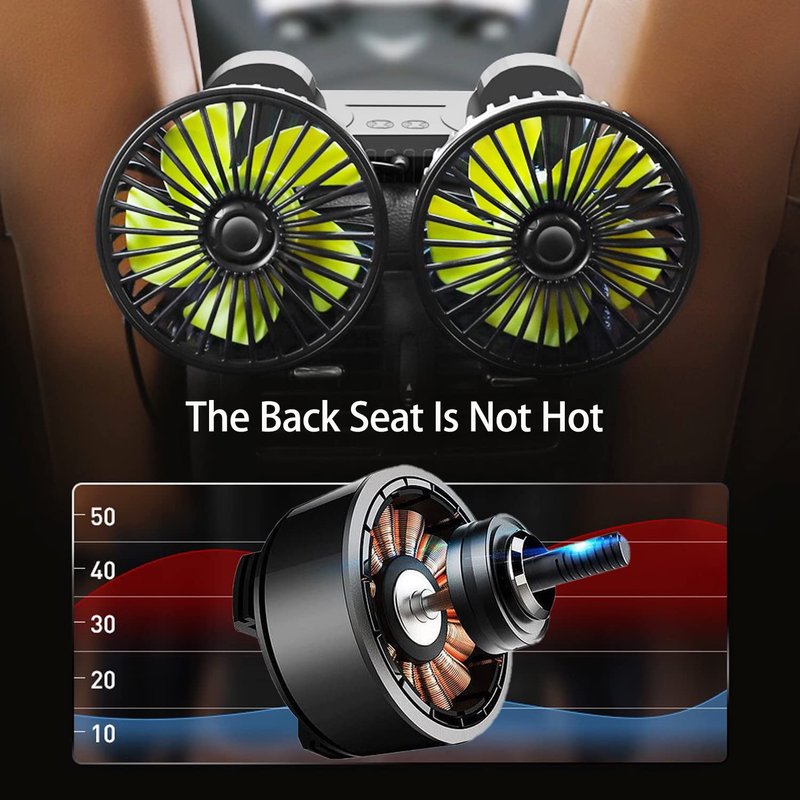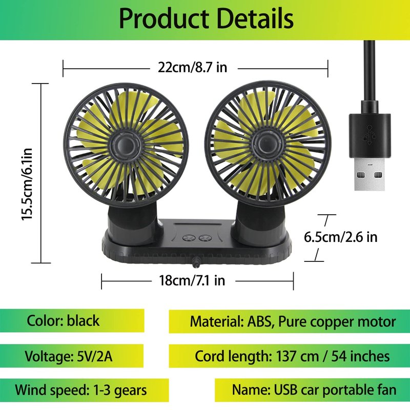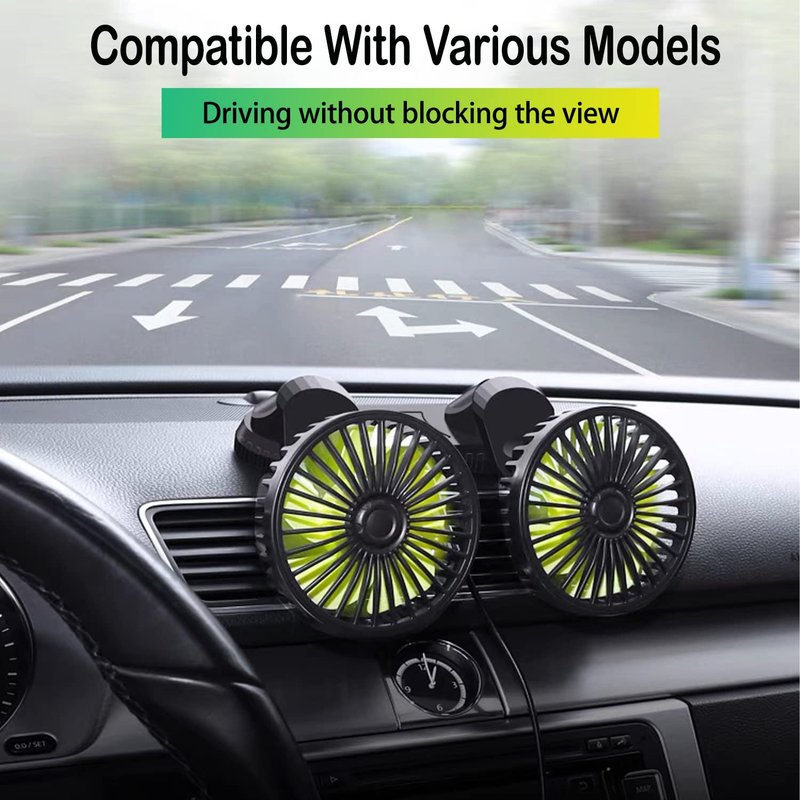 - 【Adjustble Dual Head Car Fans】This 12V/24V automobile Cooling Fan with 2 rotatable fan heads, the 2 heads can be 360°rotate and be rotated to whatever direction by manually. It can provide strong wind to cool down rear seat passengers and pets at back seat immediately when the car air conditioner is weak or no air conditioner at all.