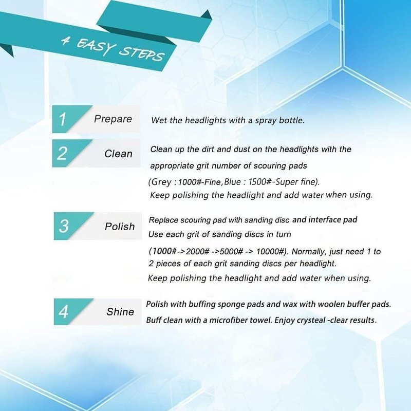 - 【EASY 4-STEP】Step 1 - Prepare a spray bottle of water and drill. Step 2 - Clean with gray scouring pads (P1000) →blue scouring pads (P1500). Step 3 - Polish with sanding discs (P1000 →P2000 → P5000 → P10000) and buffing sponge pads(orange → yellow → blue → black → green). Step 4 - Wax with woolen buffer pads. Physical restoration with headlight restoration pads, without any chemical fluid, safe and environmental-friendly.