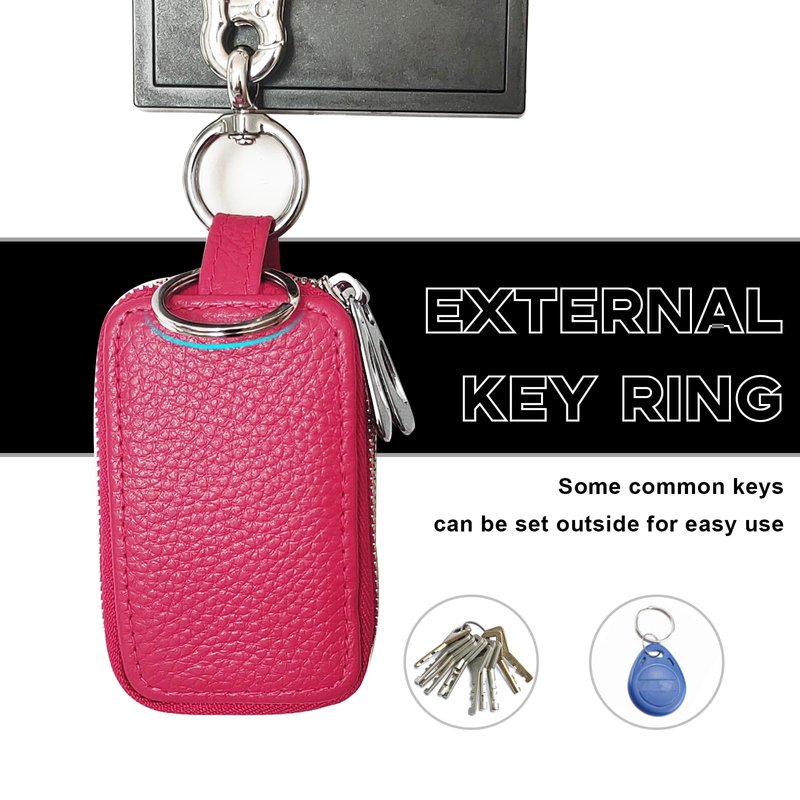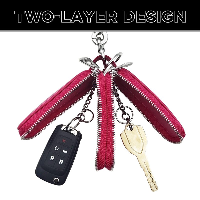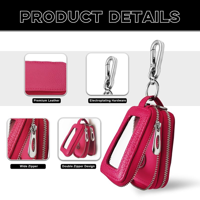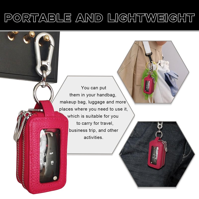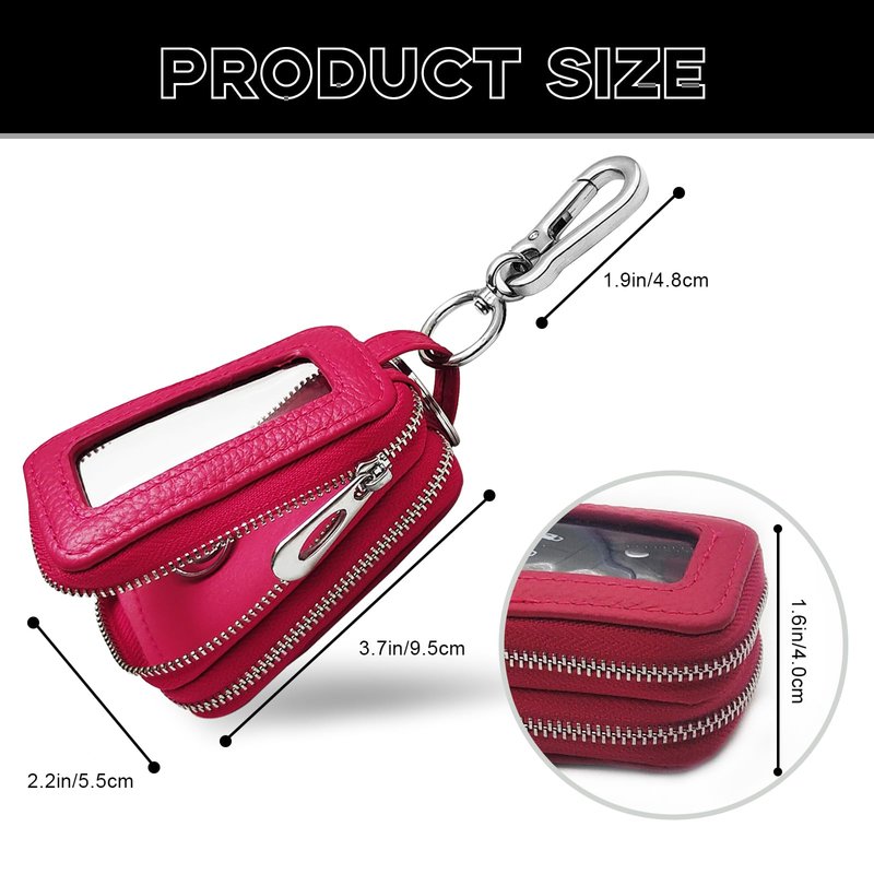 Car Key Fob Case, Double Zipper Genuine Leather Protection Key, Universal Premium Car Key Fob Case, Metal Hook and Keyring with Transparent Window for Men Women (Rose red)