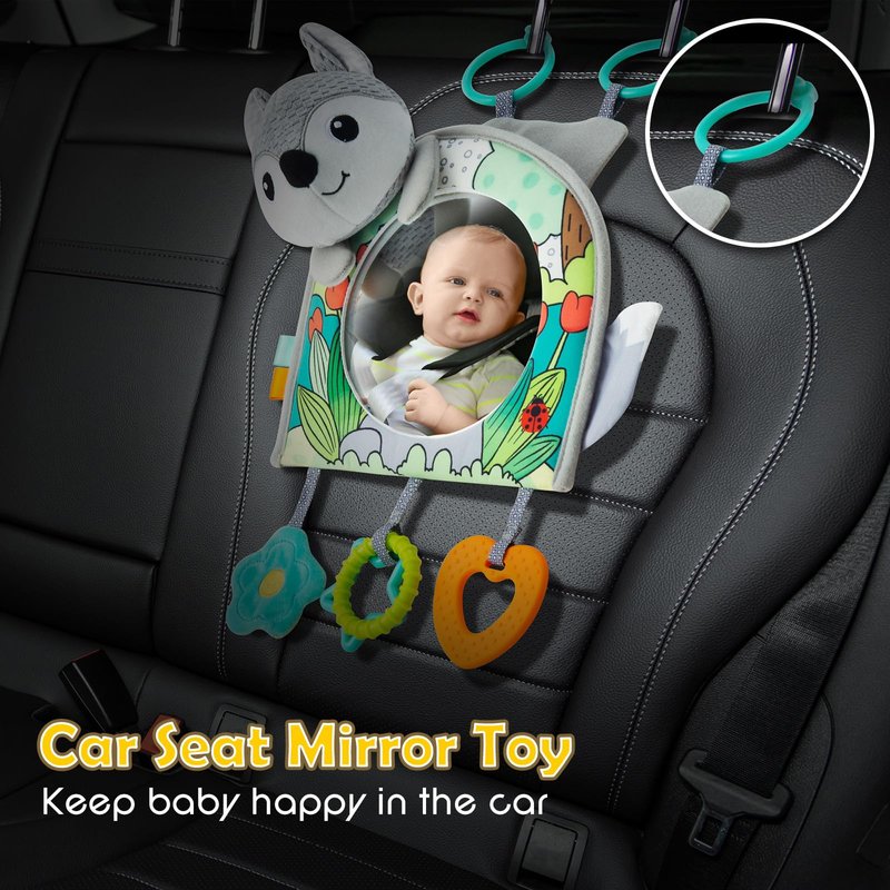 - Enhanced Activity, Endless Fun Car Seat Toy- This infant Car Seat Toy features a delightful fox design, hanging soft toys that crinkle and a teether, as well as colorful rings and a large baby-safe mirror that will keep your baby entertained during car rides.
