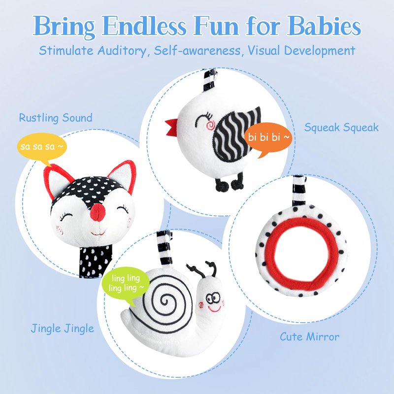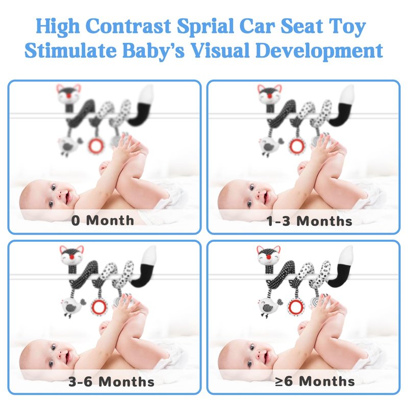 - [Develop Baby Visual Ability] The visual development of a newborn baby needs a certain period of time. When the baby is 0-12 months old, the black and white series of spiral activity baby toys is the best choice for the baby’s vision development. Adorable newborn hanging rattle toys with animal design can inspire baby's visual development and cultivating baby's color perception, encourage baby to touch and explore