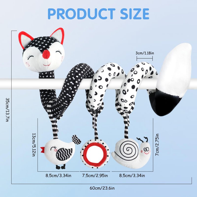 - [Multi-functional Carseat Toys for Infants] When your baby sleeps, you can put the stuffed animals toy beside your baby. The Activity Spiral Car Seat Toys can serve as your baby's sweetheart partner and accompany your baby to sleep all night. Moreover, you can put baby crib toys in the Baby Gym, Play Mats, Strollers, Cribs, Baby Car Seats, Cot etc. Any question for the baby car toys & stroller toys, please contact our customer service. We will provide 100% satisfaction for babies and parents