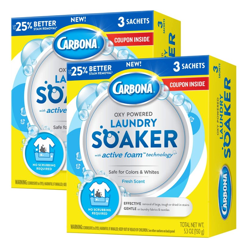 Carbona Oxy Powered Laundry Soaker with Active Foam Technology — for life’s biggest stains! Soaker starts to dissolve away tough stains, such as; dirt, grass, coffee/tea, blood, oil/grease on contact. Soaker works on a variety of colorfast fabrics and textiles, including; baby clothes, uniforms, sports jerseys, tablecloths, and more. Up to 25% better stain removal than laundry detergent alone Chlorine bleach free Safe for colors & whites No scrubbing required