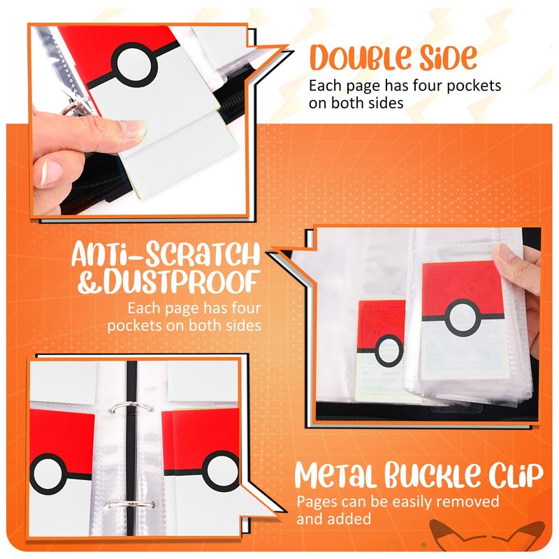 - 🔥【DOUBLE-SIDE PAGES WITH FOUR POCKETS】The binder features 50 sturdy pages, each thoughtfully designed with double-sided pockets. With four pockets on each side, you can conveniently store and organize up to 400 cards. The ample capacity ensures you have ample space to showcase your entire collection.