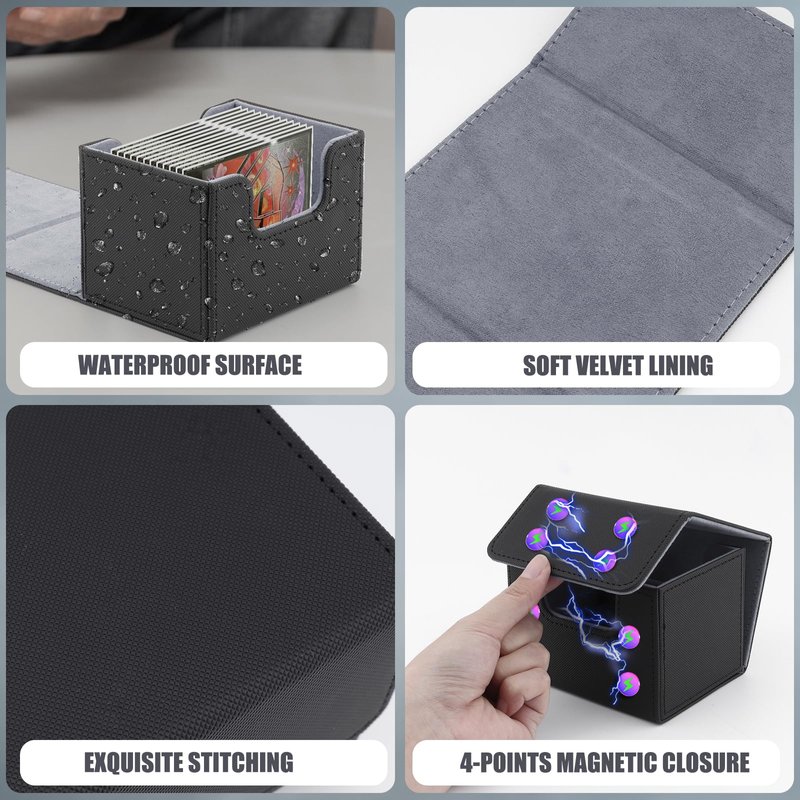 - Quality Material: mtg card deck box has two-layer construction, the outer layer that is plasticized waterproof PU leather material, and the inner layer has a soft microfiber material to protect the cards inside; It protects you from this deck.Compared with the traditional plastic card box, the durable leather card deck box gets an upgrade, and offers more room for your cards; it can hold up to 100+ double-sleeved cards, 150+ single-sleeved cards, or 220+ sleeveless cards