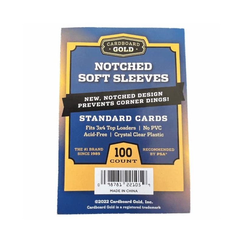 New from Cardboard Gold! Notched design helps prevent corner dings. Fits standard sized trading cards 2.5" x 3.5". Easy card insertion and removal. Crystal clear polypropylene. Archival safe, PVC Free, and acid free. Manufactured by Cardboard Gold.