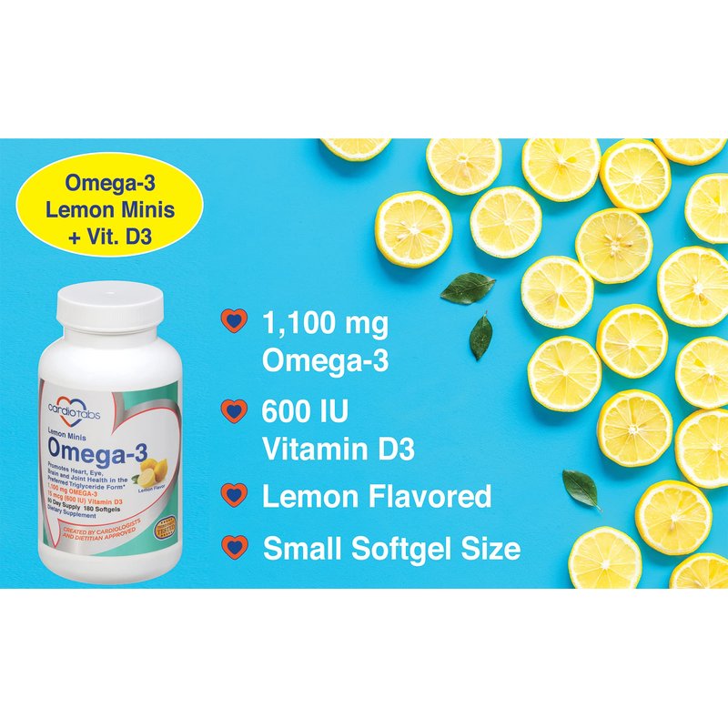 Cardiotabs Omega 3 Lemon Minis + Vitamin D3, 1,100 mg Omega-3 in Triglyceride Form and 600 IU Vitamin D3, Easy-to-Swallow, Fresh Lemon-Flavored Omega-3 Supplement Softgels - 180 count