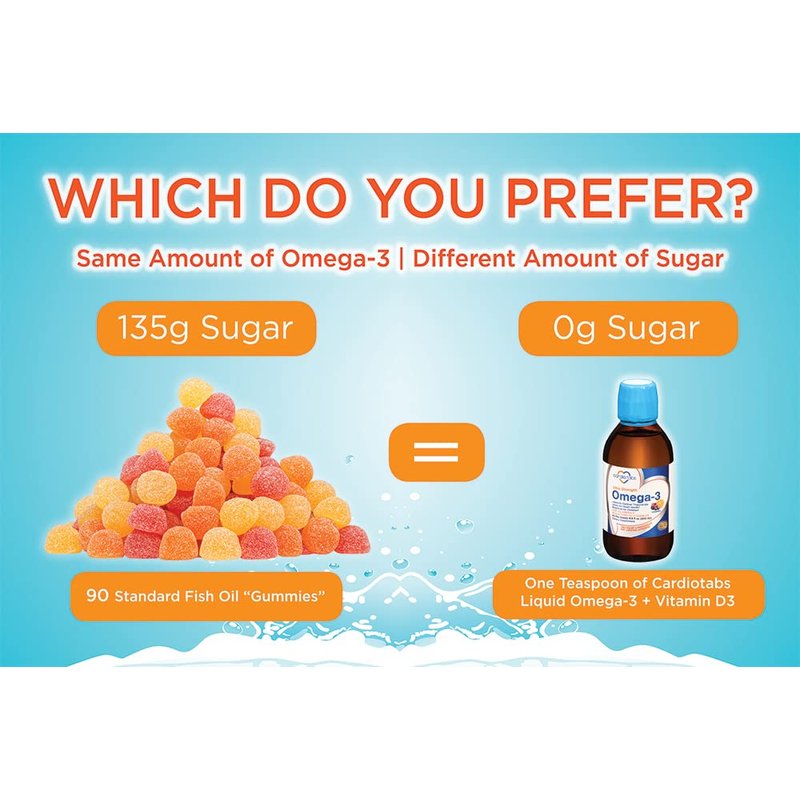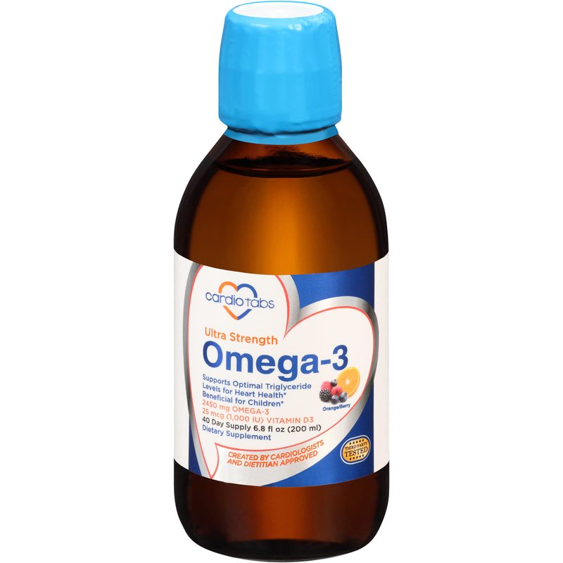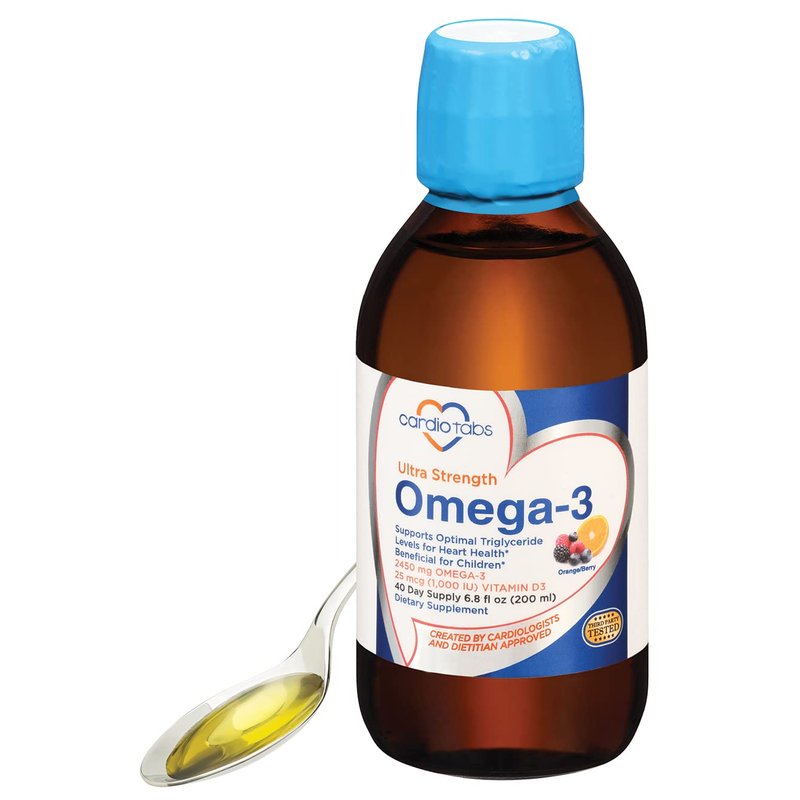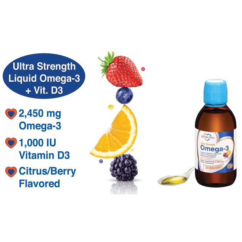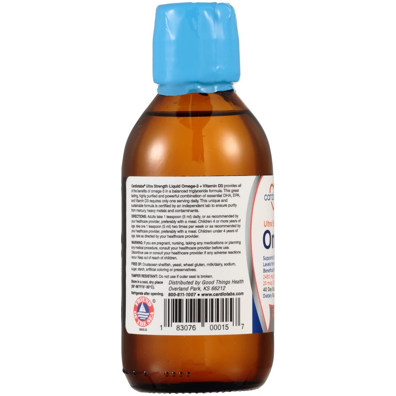 Cardiotabs Ultra Strength Liquid Omega-3 is a more absorbable and tastier form of the omega-3 supplement. With a delicious orange/berry flavor, taking this supplement that contains omega-3 and vitamin D3 is more enjoyable. The highly concentrated fish supplement has a balanced ratio of DHA to EPA and offers a total of 4500mg of omega-3 marine oil from fish oil and calamarine. It also provides 1000 IU of vitamin D3 per serving, a fat-soluble vitamin that helps the body better utilize calcium from food and supplements. Serving recommendations: Adults should take one teaspoon (5ml) daily, children four years or older should take one teaspoon (5ml) twice per week, and children under four years should take the fish oil supplement as directed by a healthcare provider. One bottle of our Ultra Strength Omega-3 contains 6.8 fl oz (200ml).