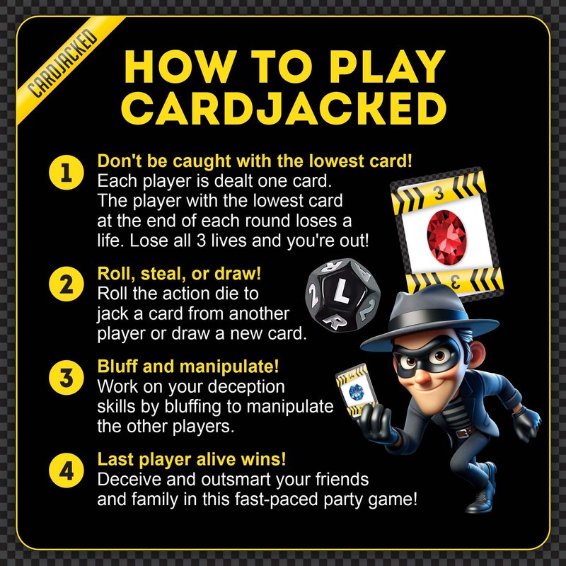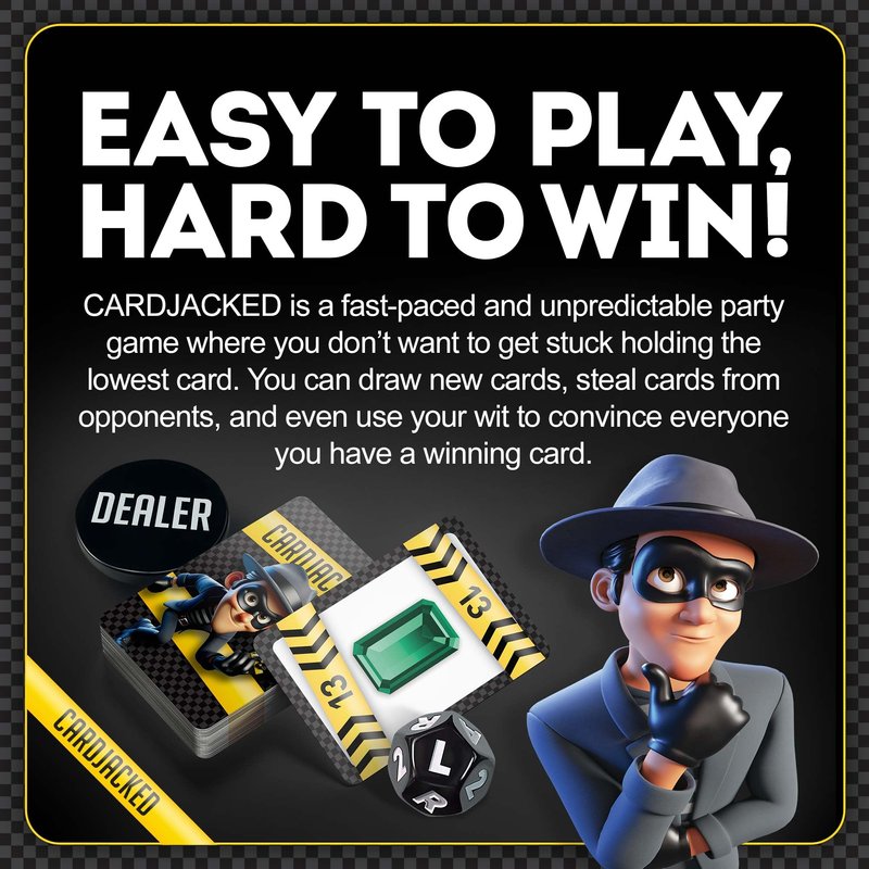 - Thrilling Party Game: CARDJACKED is a fast-paced and unpredictable game where luck and larceny collide, perfect for 4-10 players aged 8 and up.