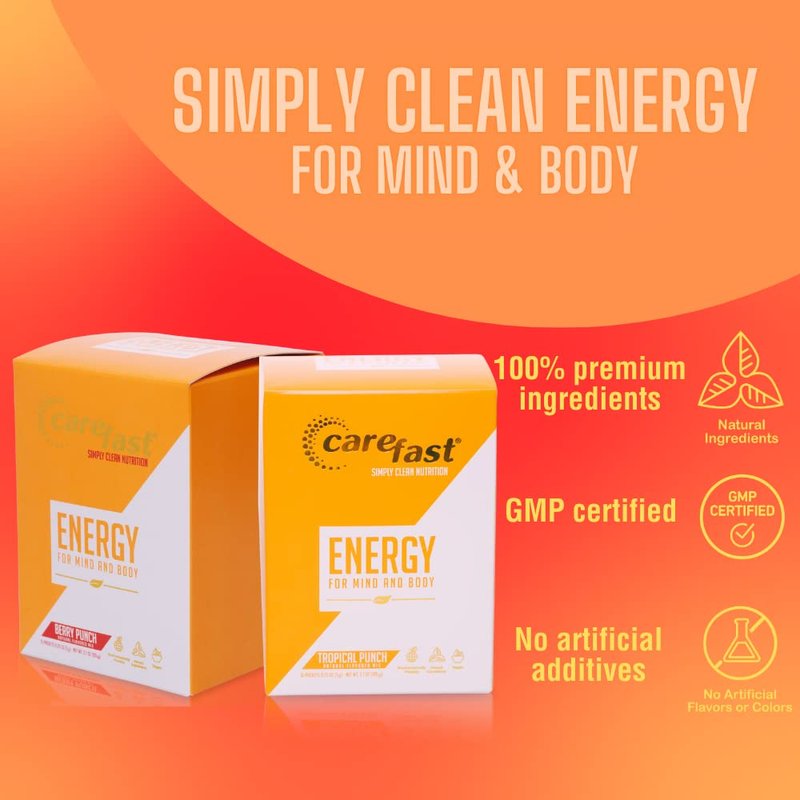 - PUT SOME PEP IN YOUR STEP: Get an extra boost throughout the day with the Energy Powder drink mix Tropical Punch. We created CareFast Energy for students preparing for a long lecture, office workers who hit their mid-day slump, people looking to make the most out of their night, and those who want to get the best out of their workout. If you’re looking for a no-nonsense energy solution that can take with you anywhere on the go, CareFast is here to save the day.