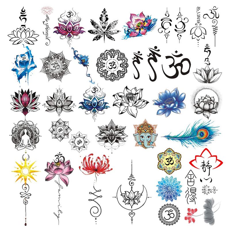 - 【Style and Elements】 30 sheets of Yoga style temporary tattoos in different size including lotus, OM, Sanskrit, Tibetan, lycoris, mandala, flower, elephant, moon, peacock feather, meditation, fearless, golden sun and more.