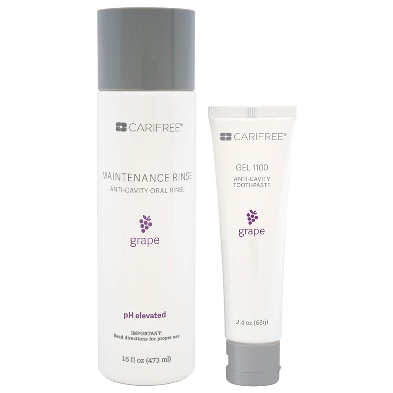 The CariFree Maintenance & Prevention Kit contains a 1-month supply of our two most popular products, 1 bottle of the Maintenance Rinse (formally known as CTx3 Rinse), and 1 tube of the CariFree Gel 1100 (formally CTx4 Gel 1100) both in grape flavor. Just like our CTx7 Kit but without the box, so we pass on the savings to our customers! Best if used for long-term prevention and maintenance. Alcohol-free, Dentist recommended anticavity for: Ages 6+