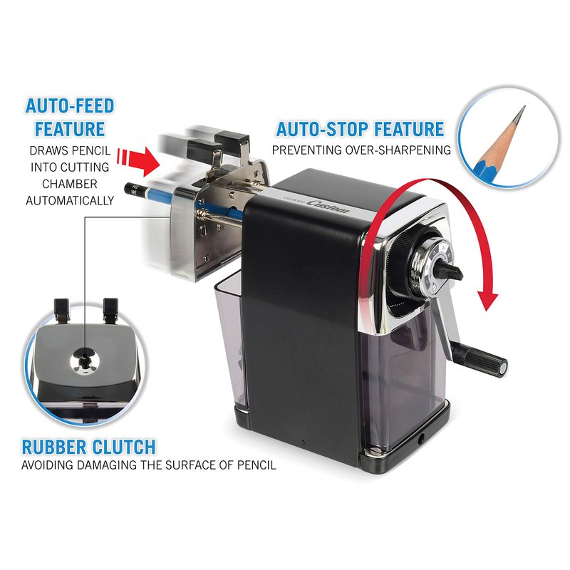 - Automatically pulls pencil into cutting chamber and prevents oversharpening
