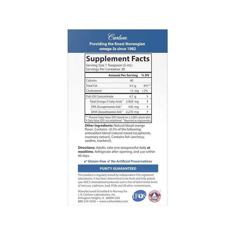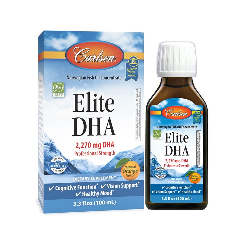 Elite DHA in delicious orange flavor provides a highly concentrated dose of 2,270 mg of DHA in a single teaspoon to support mood and overall health. DHA is an important omega-3 for people of all ages, especially for women who are pregnant or nursing. Elite DHA professional-strength liquid in rTG form, is a great option for those who want to receive more DHA per serving or who have trouble swallowing soft gels. To ensure maximum freshness, Carlson Elite DHA is closely managed from sea to store and tested by an FDA-registered laboratory for freshness, potency, and purity. Elite DHA is bottled at Carlson Healthy Oils, an eco-friendly, modern facility off the coast of Norway in an area where marine oil production dates back more than 130 years.
