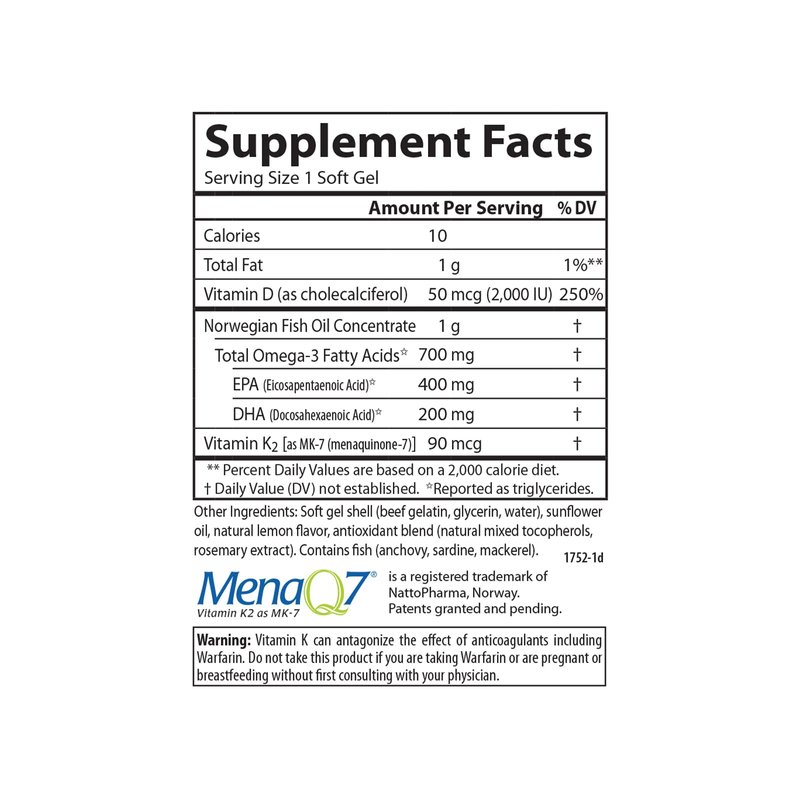 Get the benefits of the most important omega-3s EPA and DHA, plus vitamins D3 and K2 as MK-7 in a single supplement. Just one Elite Omega-3 + D3 & K2 soft gel provides 700 mg of omega-3s; 2,000 IU (50 mcg) of vitamin D3; and 90 mcg of MK-7. There are more than 40,000 published studies on omega-3s, making them some of the most studied nutrients in the world. The most beneficial omega-3s EPA and DHA promote whole body health. Vitamin D3 is an important nutrient linked to many health benefits, including bone, teeth, muscle, and overall health. What makes it so unique is that it's a vitamin we can get through food and a hormone our body makes from the sun. Despite the multiple ways of getting vitamin D3, many are still deficient due to changing seasons, age, and sun protection. Vitamin K2 as MK-7 is an essential nutrient our body can't make, which is why a supplement may be the best option. MK-7 plays an important role in binding calcium to the bone matrix.