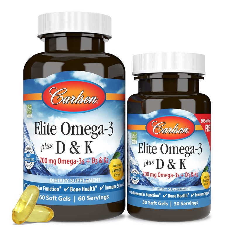 Carlson - Elite Omega-3 Plus D & K, 700 mg Omega-3s + D3 & K2, Function, Bone Health & Immune Support, Lemon, 60+30 Softgel