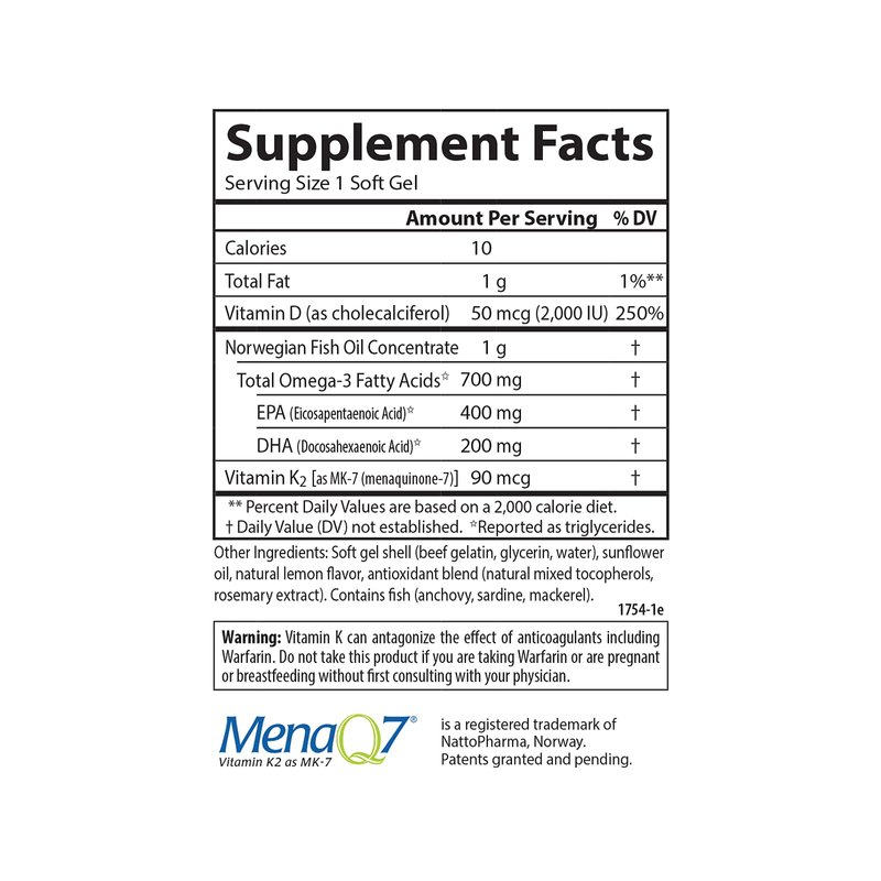Get the benefits of the most important omega-3s EPA and DHA, plus vitamins D3 and K2 as MK-7 in a single supplement. Just one Elite Omega-3 + D3 & K2 soft gel provides 700 mg of omega-3s; 2,000 IU (50 mcg) of vitamin D3; and 90 mcg of MK-7. There are more than 40,000 published studies on omega-3s, making them some of the most studied nutrients in the world. The most beneficial omega-3s EPA and DHA promote whole body health. Vitamin D3 is an important nutrient linked to many health benefits, including bone, teeth, muscle, and overall health. What makes it so unique is that it's a vitamin we can get through food and a hormone our body makes from the sun. Despite the multiple ways of getting vitamin D3, many are still deficient due to changing seasons, age, and sun protection. Vitamin K2 as MK-7 is an essential nutrient our body can't make, which is why a supplement may be the best option. MK-7 plays an important role in binding calcium to the bone matrix.