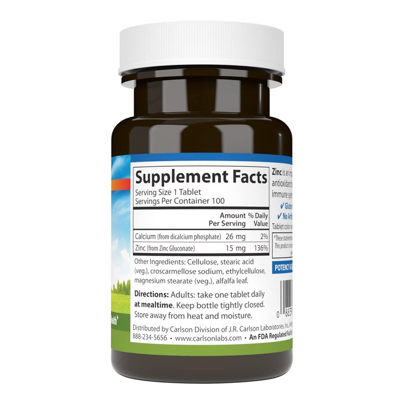 - 15 MG OF ZINC - Each tablet of Carlson Zinc provides 15 mg of zinc from zinc gluconate.