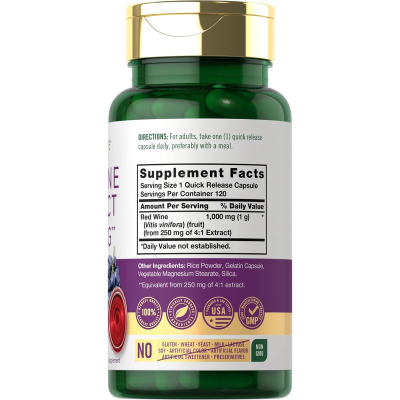 - TRADITIONAL FORMULA: The equivalent of 1,000 mg of Red Wine per serving in quick-release capsules