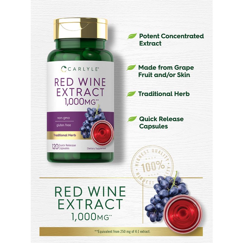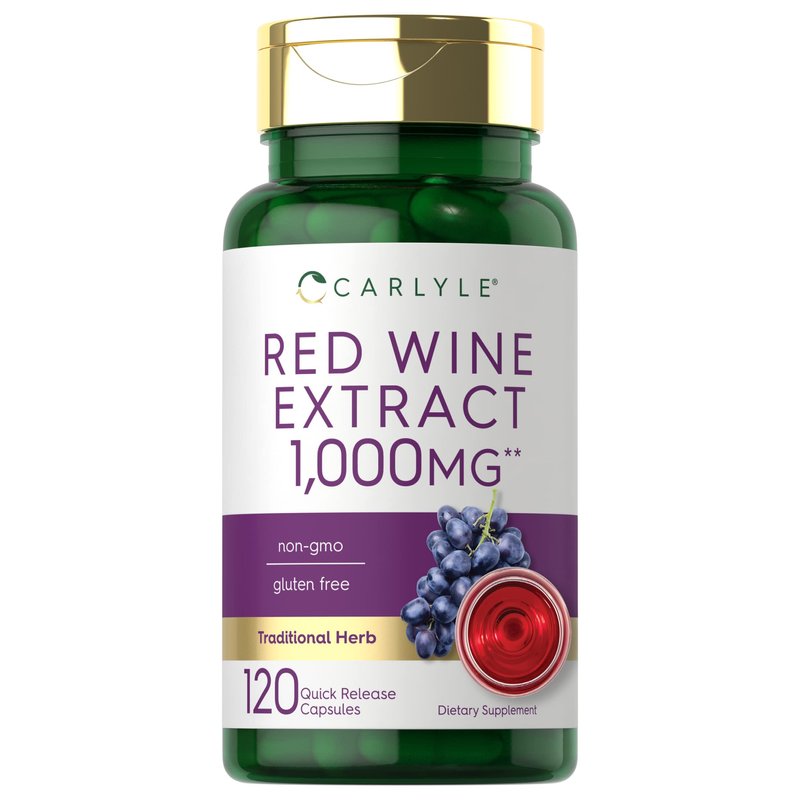 Supplementing with Red Wine: For years, nutritionists have touted the nutritional benefits of red wine for many reasons. Red wine contains naturally occurring polyphenol antioxidants and nutrients derived from red grapes. Now there is an easier way to get the benefits of a glass of wine without alcohol in convenient supplements like powder, tablets, liquid, and capsules. Carlyle Red Wine Extract: At Carlyle, our Red Wine Extract is a highly advanced gluten-free and non-GMO supplement, featuring the equivalent of 1,000 mg of Red Wine in quick-release capsules. We put our ingredients to the test, ensuring exceptional purity and potency, always giving you the best quality you deserve. Enjoy Carlyle Red Wine and get exceptional value today with our 120-capsule supply! Rooted in Wellness: Our expertise in sourcing the purest ingredients combined with advanced technologies makes us proud to deliver premium, honest supplements at the best value. Carlyle Red Wine Extract is a testament to our commitment to excellence, made with powerful ingredients rooted in wellness. Thanks for choosing us in your pursuit of living healthy!