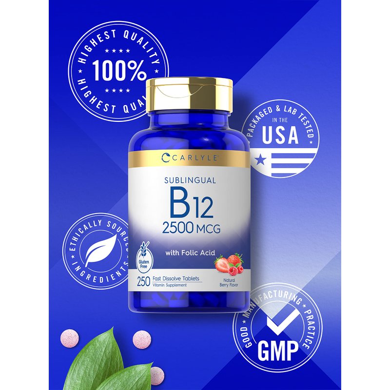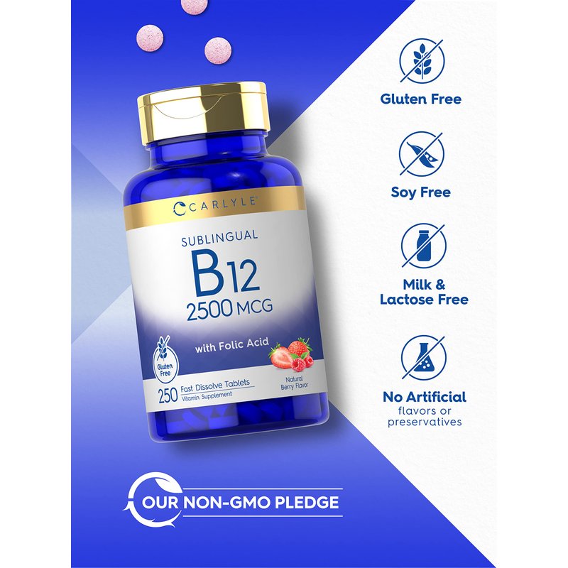 Carlyle Vitamin B12 Sublingual 2500 mcg | 250 Fast Dissolve Tablets | Cyanocobalamin Supplement with Folic Acid for Adults | Natural Berry Flavor | Vegetarian, Non-GMO, and Gluten Free