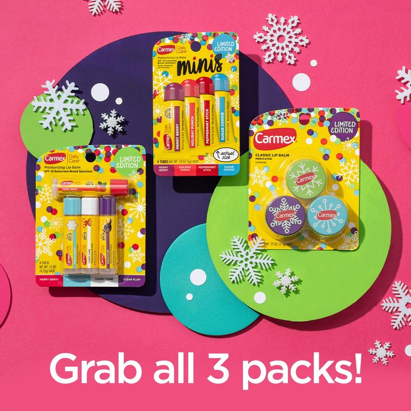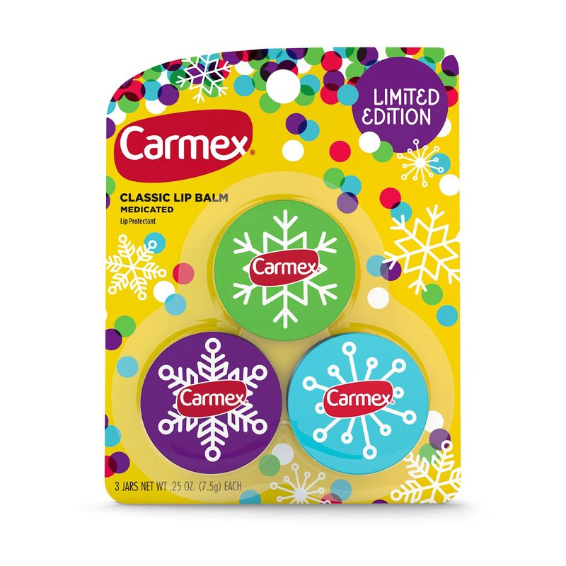 - Three 3 count packs of Carmex Medicated Lip Balm Limited Edition Holiday Jars