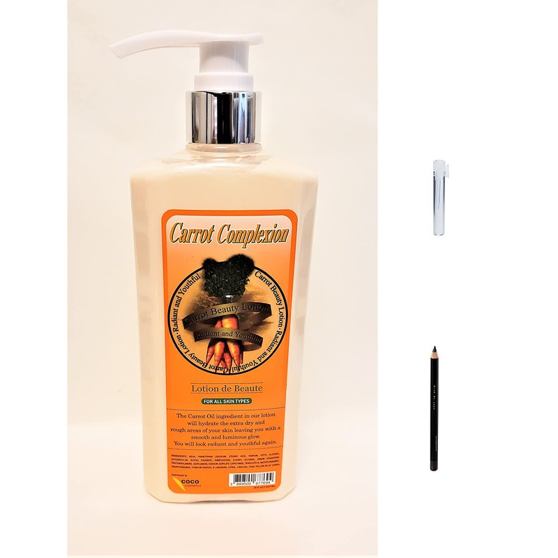 Carrot Complexion Lotion 18floz Bottle + [Hair - Nail and Body Apricot & Coconut Oil Vial Sample & Liner101 LPS40 Eye Pencil]