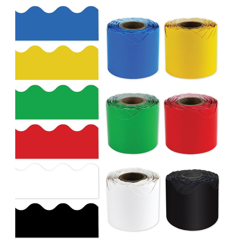 - What’s Included: The colorful décor set includes 6 rolls of scalloped blue, yellow, green, red, white, and black bulletin board borders, measuring 36 feet x 2.25 inches each for a total of 216 feet of bulletin board borders.