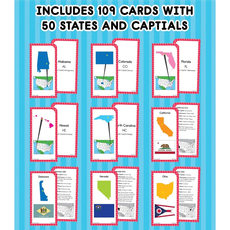 - US States and Capitals Flash Cards: Turn your child’s social studies lessons into fun, educational games that bring learning to life with Carson Dellosa’s US States and Capitals Flash Cards!