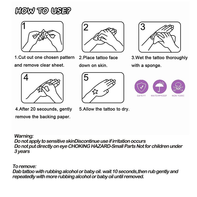 - EASY TO APPLY--Fear for the pain? No worry any more. Our fashion temporary tattoos is easy to use. First, Wipe your skin clean, Then stick the pattern face down on the skin then cover with wet sponge for 20-30 seconds, and uncover the back paper, you will get a perfect tattoo! And it can be easily removed with alcohol or baby oil.
