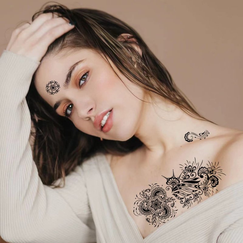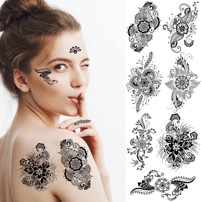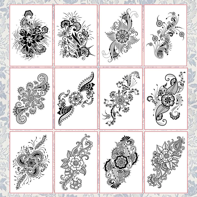 - HENNA FLOWER TEMPORARY TATTOOS--the fake temporary tattoos has 12sheets different black flower patterns. you can used these tattoos for arms, shoulders,legs, show your personality