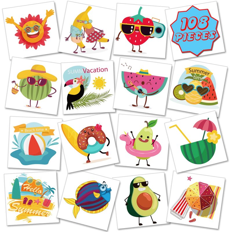 - SUMMER TEMPORARY TATTOOS--You will receive 108 sheets summer party tattoos in 54 patterns, 2 pieces for each pattern, our temporary tattoos are individually packaged, easy to carry, and can be distributed to kids and friends individually, no need to use scissors , which can ensure the safety of children when they are playing.
