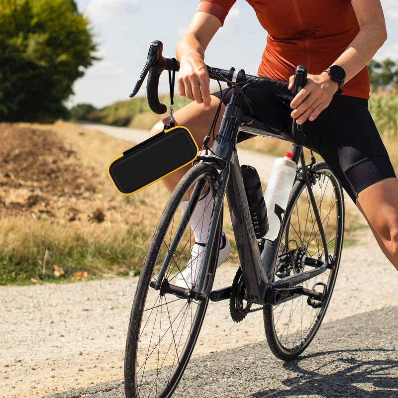 2. Tire inflator storage box has multiple protection layers, includes hard EVA shell, soft inner lining and elastic belt to ensure that bike air pump with gauge machine is always in safe and good condition.