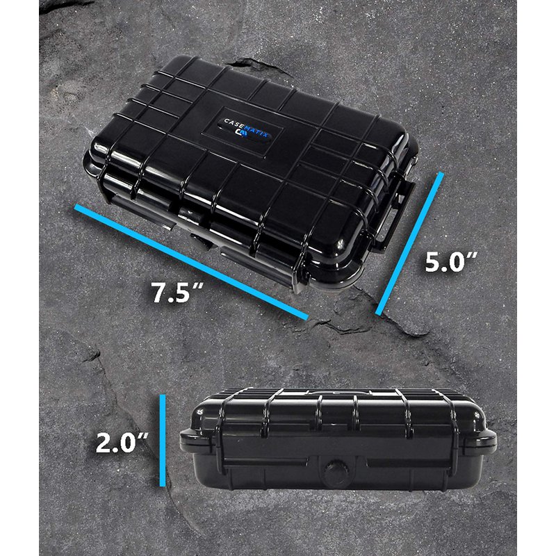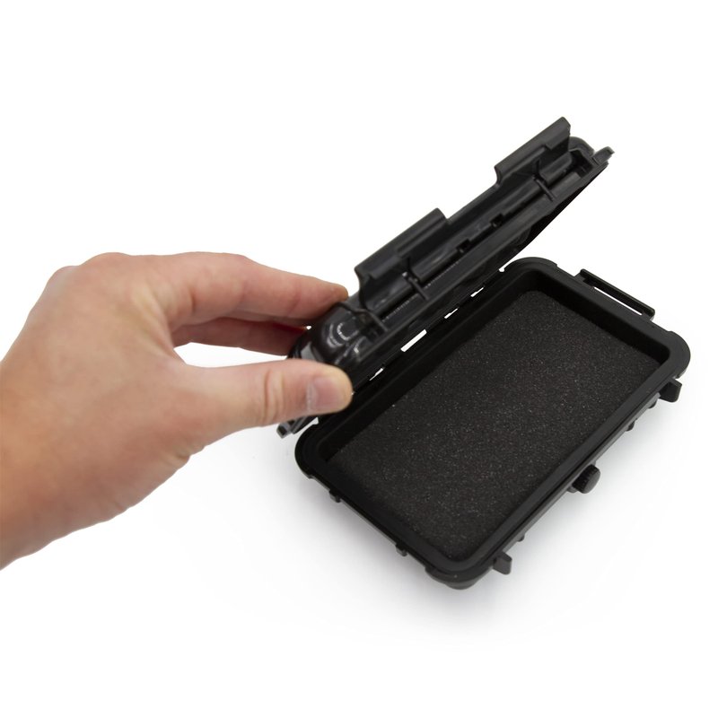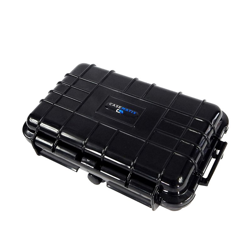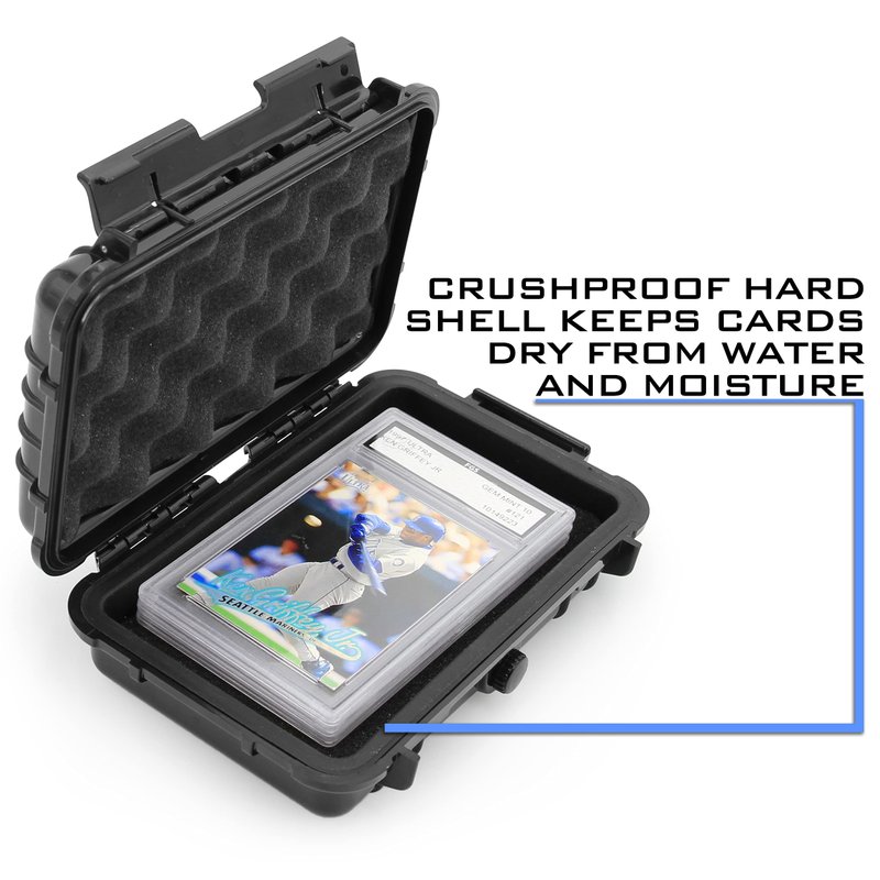 CASEMATIX graded card storage box securely holds up to 5 slabbed and graded cards. The rigid exterior protects from impacts while the padded interior protects from scratches. Foam top and bottom interior can compress to snugly hold cards in place. Case features a waterproof o-ring seal that locks out air and moisture for a truly protective card carrying case. An integrated pressure release valve allows for air release when changing altitudes.