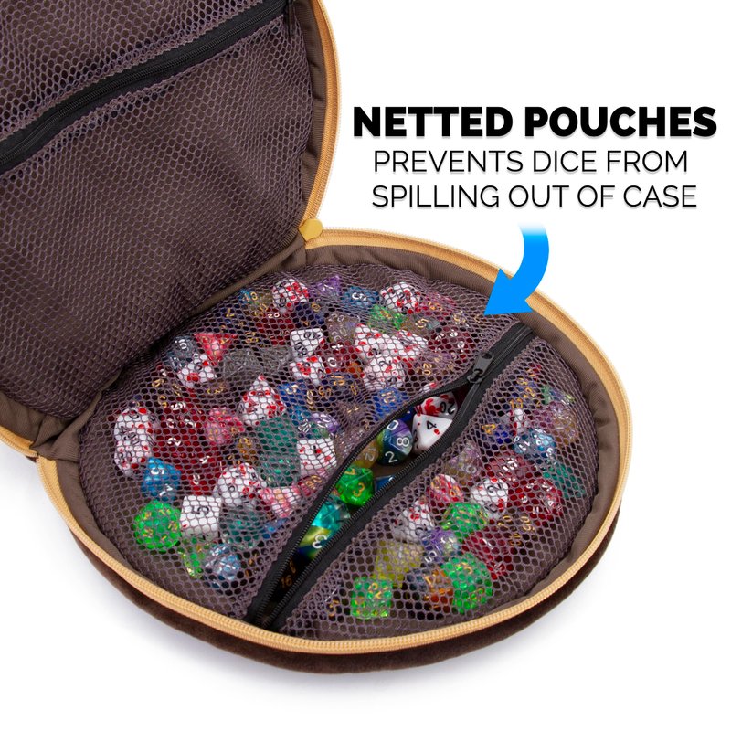 - Internal Zipper Pouches: To prevent dice from spilling out of the dice storage case when opened, it features two netted pouches and can be opened up completely so you can quickly find your desired dice. Forget digging through a large dice bag!
