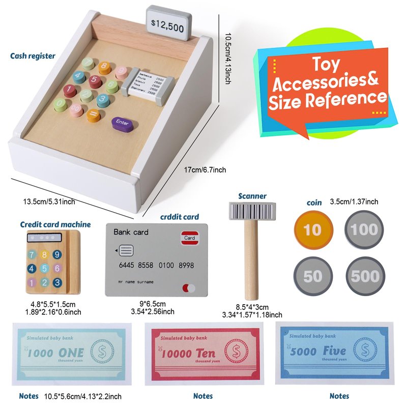 - MULTIPLE PLAY OPTIONS: The cash register toy set comes with a variety of play money and coins, allowing children to create their own scenarios and play games. They can pretend to be store owners, customers, or bankers, and use the cash register to practice different financial transactions.