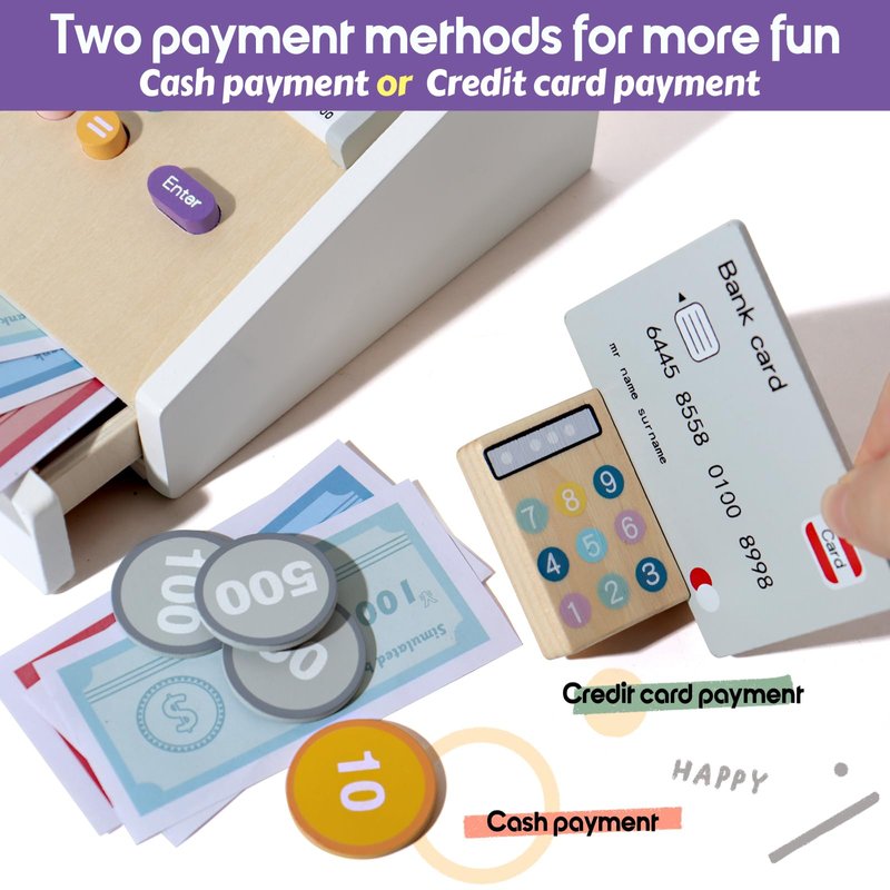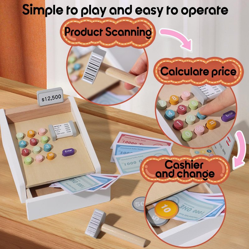- PRETEND PLAY: Children can use the cash register to simulate real-life shopping experiences, making it a fun and engaging way to learn about money and commerce. They can practice making transactions, counting coins and bills, and solving math problems, all while having fun.