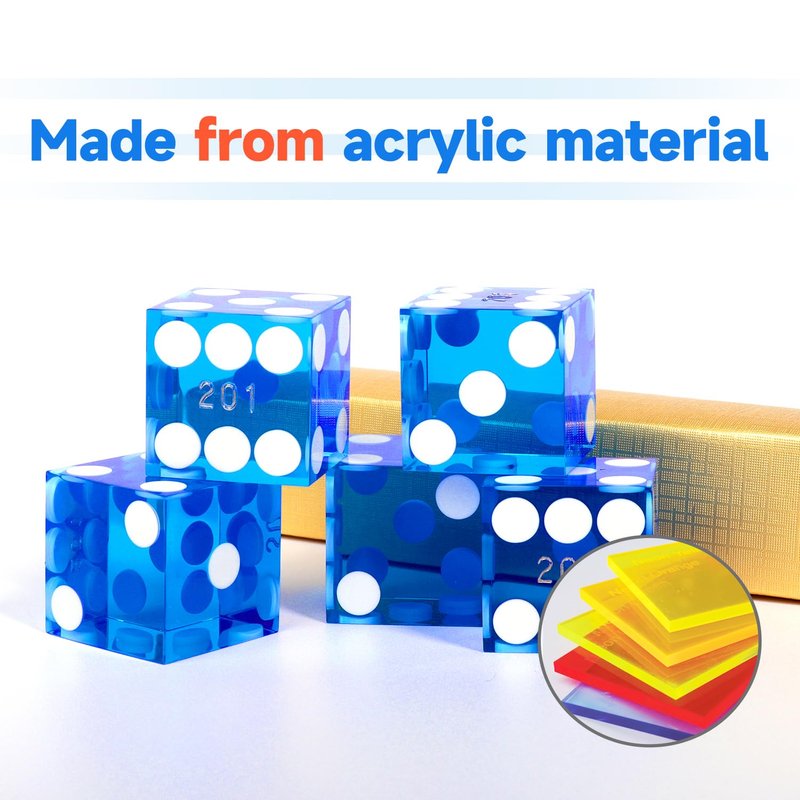 - Professional Dice: The casino dice are made from high-quality acrylic material under strict security controls, free from defects, with polished finish; the spots on their faces are made flush to ensure there is no imbalance on the dice