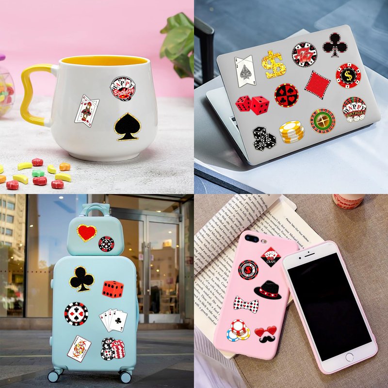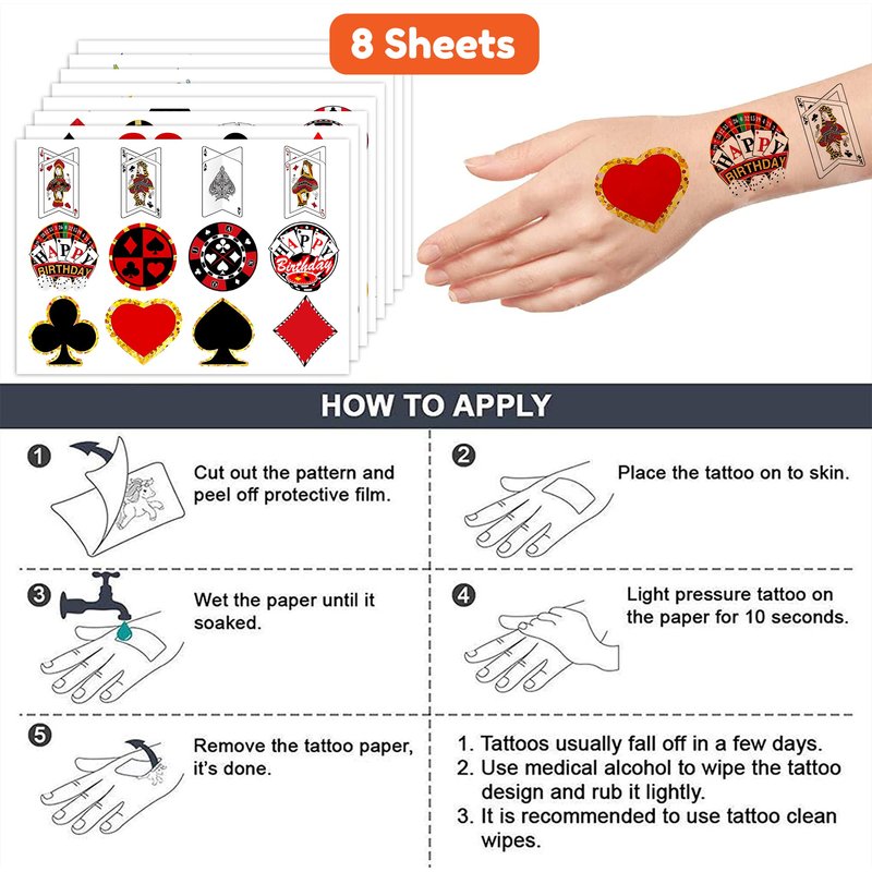 - Casino Party Decoration: The set contains instructions for use and is easy to use. Casino tattoo stickers can be applied on arms, face, hands, neck, shoulders, legs, wrists and ankles to make you look cool at all kinds of parties. Popular hit with your kids. You can apply them to your body or some smooth objects, for example, glass, stationery, paper, crafts cups, cabinet, bottle.