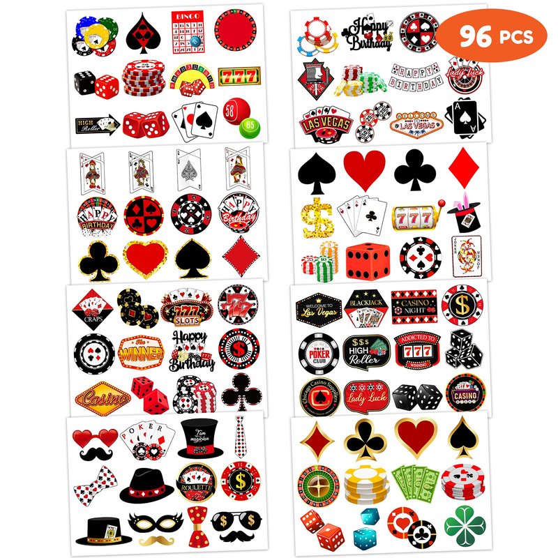 - Casino Party Supplies: 8 Sheets Casino temporary tattoos stickers, Have a variety of cartoon themed characters, Children can easily Casino stickers and take unique photos to make fond memories. The size of each sheet is 6.1 * 3.1 inches.