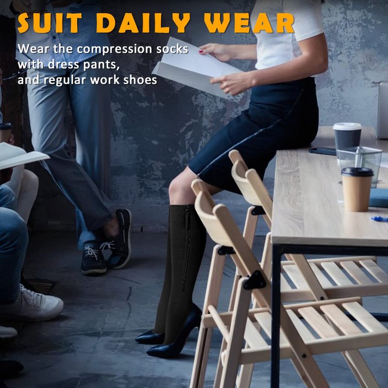 - 🔥 SUIT EVERYDAY WEAR: The compression socks with zippers are perfect for everyday use and outdoor activities. Our compression socks for women men with zippers benefit the people whose jobs require sitting or standing for a long time, such as Office staff, doctors, nurses, crew, flight attendants, hairdressers, salesmen, police officers, pregnant and the elderly. It helps reduce and prevent swelling for the wearer, maintaining positive circulation and leg health.